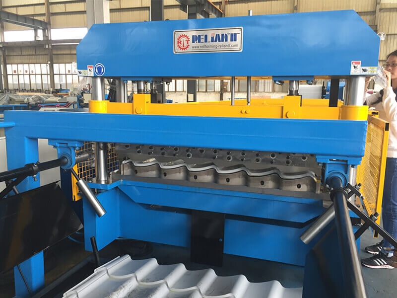 Roll tile roll forming machine can rollform metal roofing step tiles which are widely used in civilian construction. The product of this roll forming machine features novel appearance, level surface, uniform ripple, high usage and autoimmunization, low cost and durability.